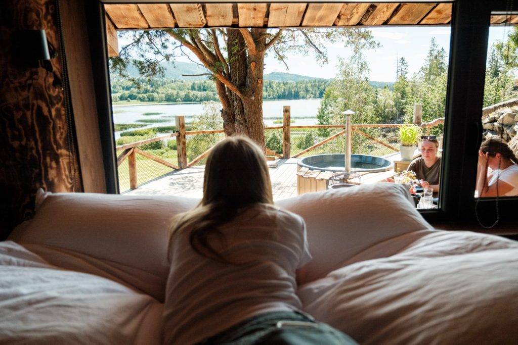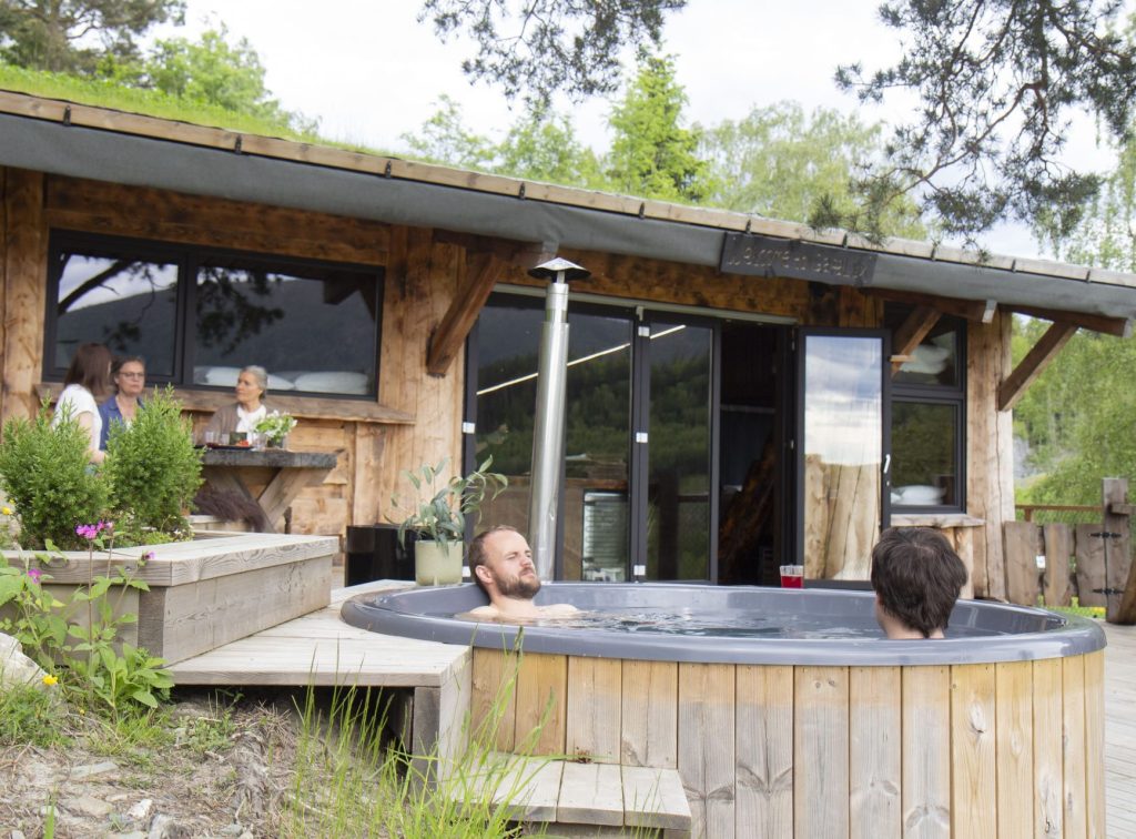 Welcome to our unique and luxurious overnight shelter. Here you will be able to drink your morning coffee with a fantastic view of Lake Hammervatnet, enjoy a good meal with products from our own farm shop on the fire pit, end the evening with a hot bath in the hot tub on the terrace and sleep on quality mattresses.