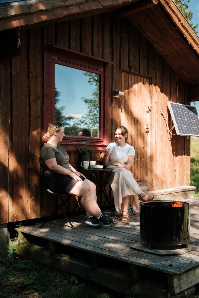 Hytta har enkle utemøbler og en liten grill som gjerne må brukes